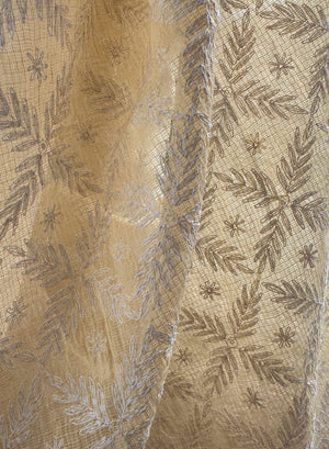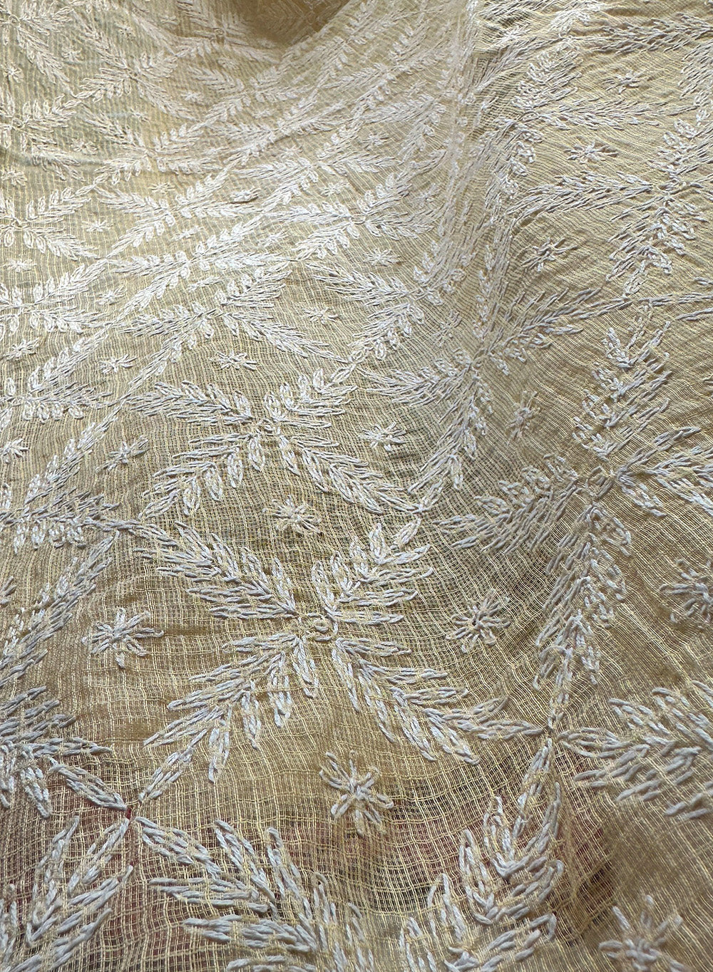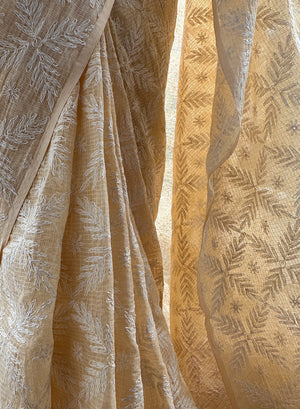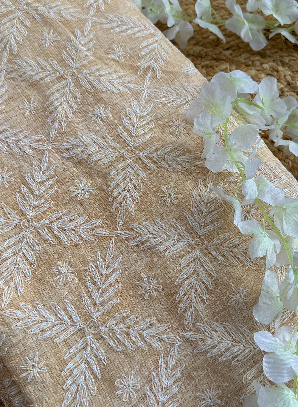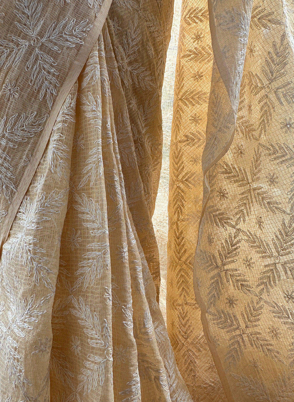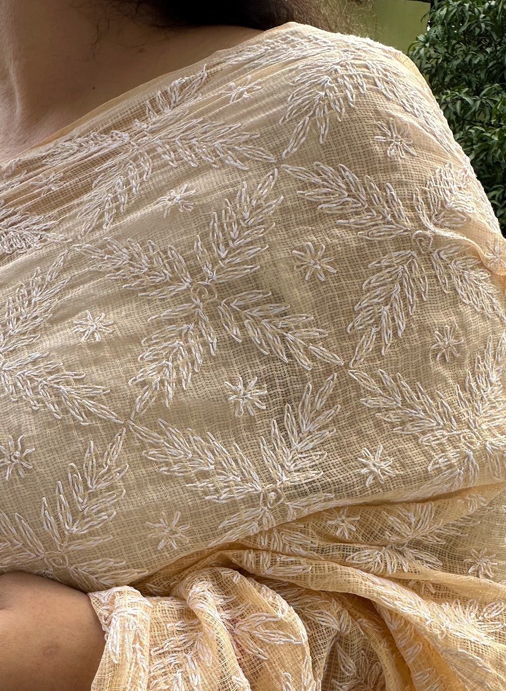 Our stunning Light Orange Kota Doria Saree from the Shabnam Collection, has been hand embroidered on a kota base, with twisted cotton thread with tepchi embroidery.