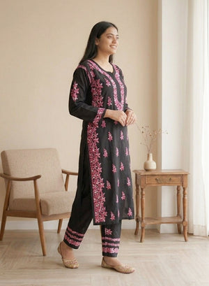 The deep black fabric creates a striking contrast against the fine white embroidery, while hints of soft coloured threads add a graceful charm, making it perfect for both day and evening wear. Paired with a comfortable palazzo, this set ensures effortless style without compromising on comfort.