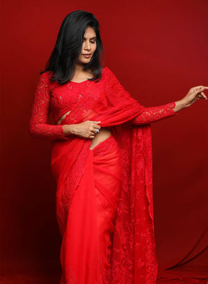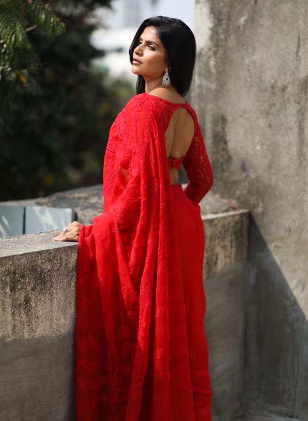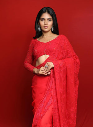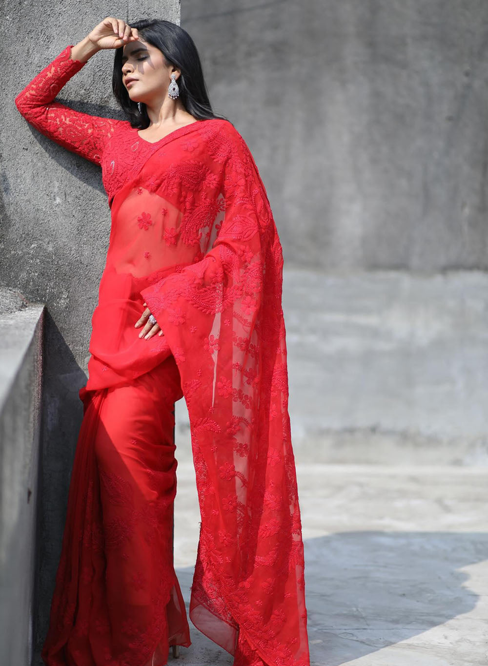 Hand embroidered with self thread resham thread, a heavy skirt border, this saree is a beautiful example of Chikankari embroidery.