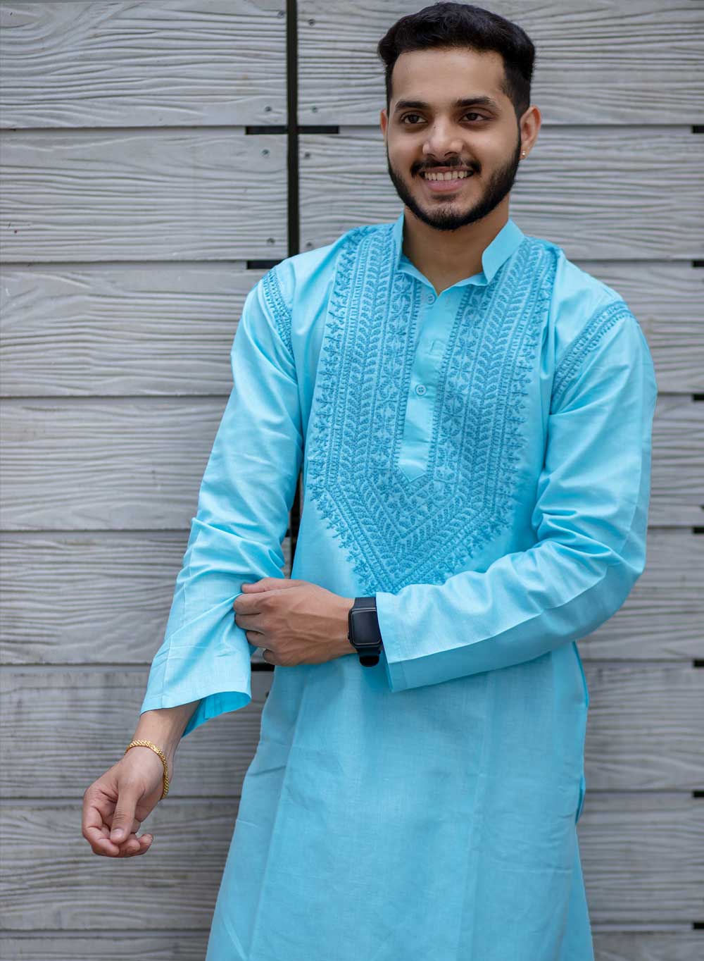 Sky Blue - Nawab Cotton Men Chikankari Long Kurta