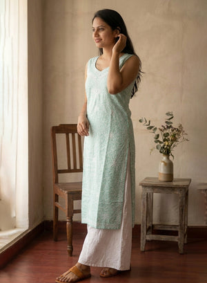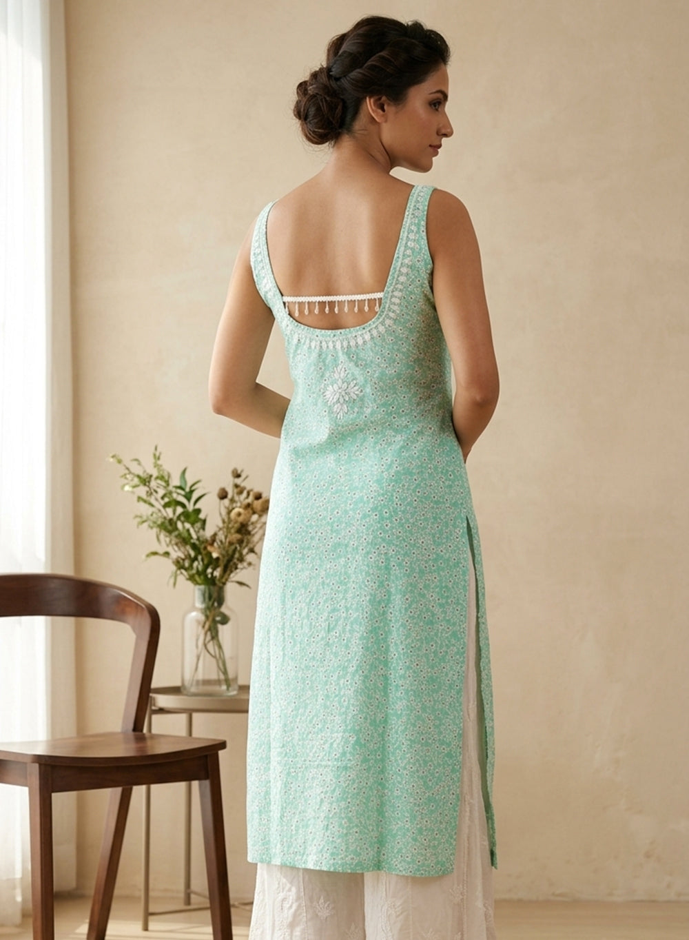 Surbhi Sea Green Printed Mul Cotton - Bahaar Noodle Strap Chikankari Kurta