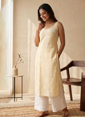 Surbhi Light Yellow Printed Mul Cotton - Bahaar Noodle Strap Chikankari Kurta