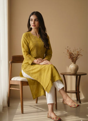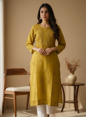 Swara Mustard - Anjuman Chanderi Cotton Chikankari Kurta