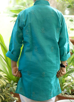 Our Navy Blue Cotton Kurta with hand embroidered chikankari in a traditional neck booti ,for Chhote Nawabs, are woven from finely milled cotton terry voile, cool and crisp against their soft skin.