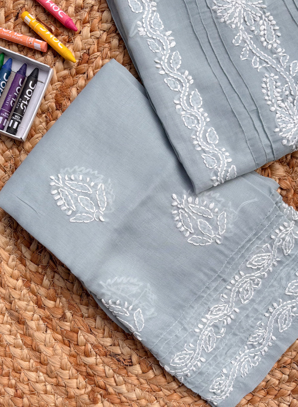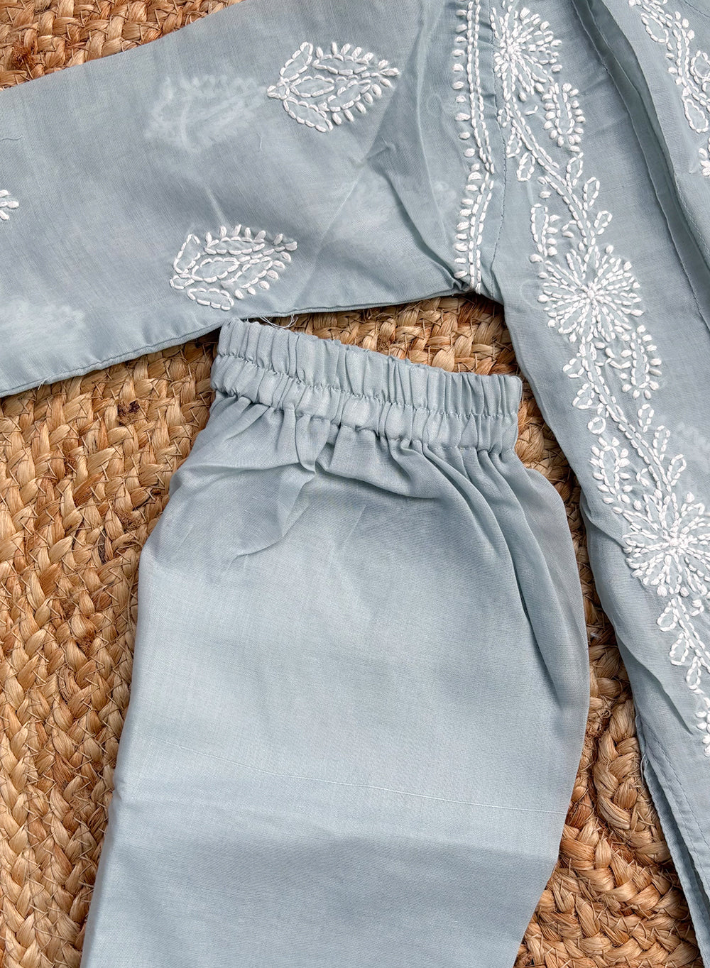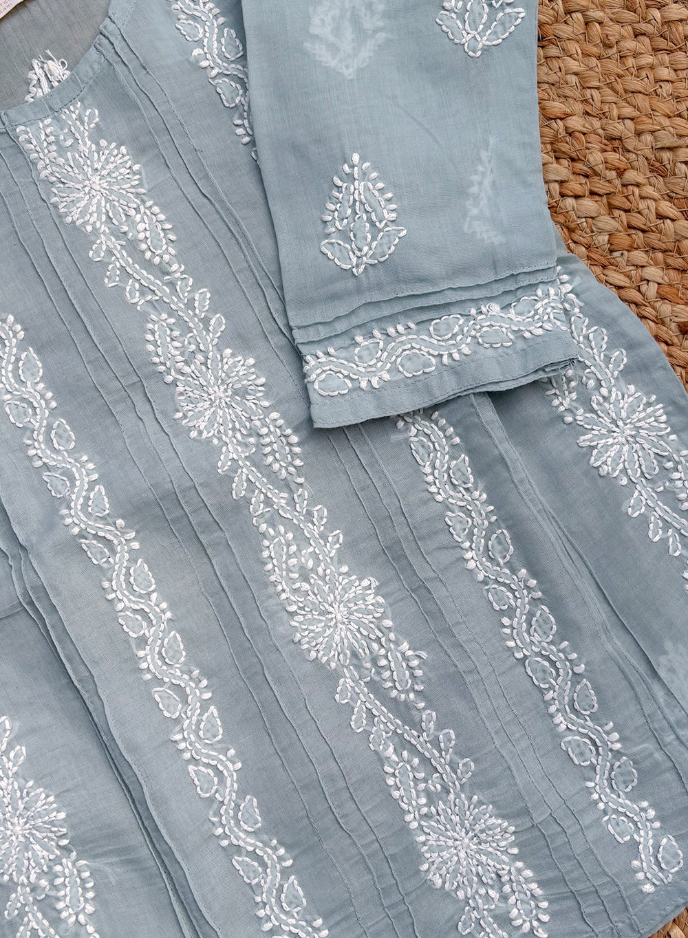 Crafted in soft, breathable cotton, the kurta features a refined front panel design with intricate hand-embroidered self-thread chikankari, meticulously crafted by skilled artisans.