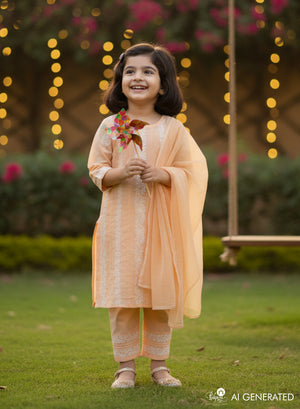 The Titli Cotton Kurta With Pants & Chiffon Dupatta Set is a beautiful harmony of tradition and comfort, designed for little ones who love to move and explore.