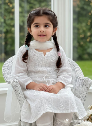 The White Cotton Kurta With Pants & Chiffon Dupatta Set is a beautiful harmony of tradition and comfort, designed for little ones who love to move and explore.