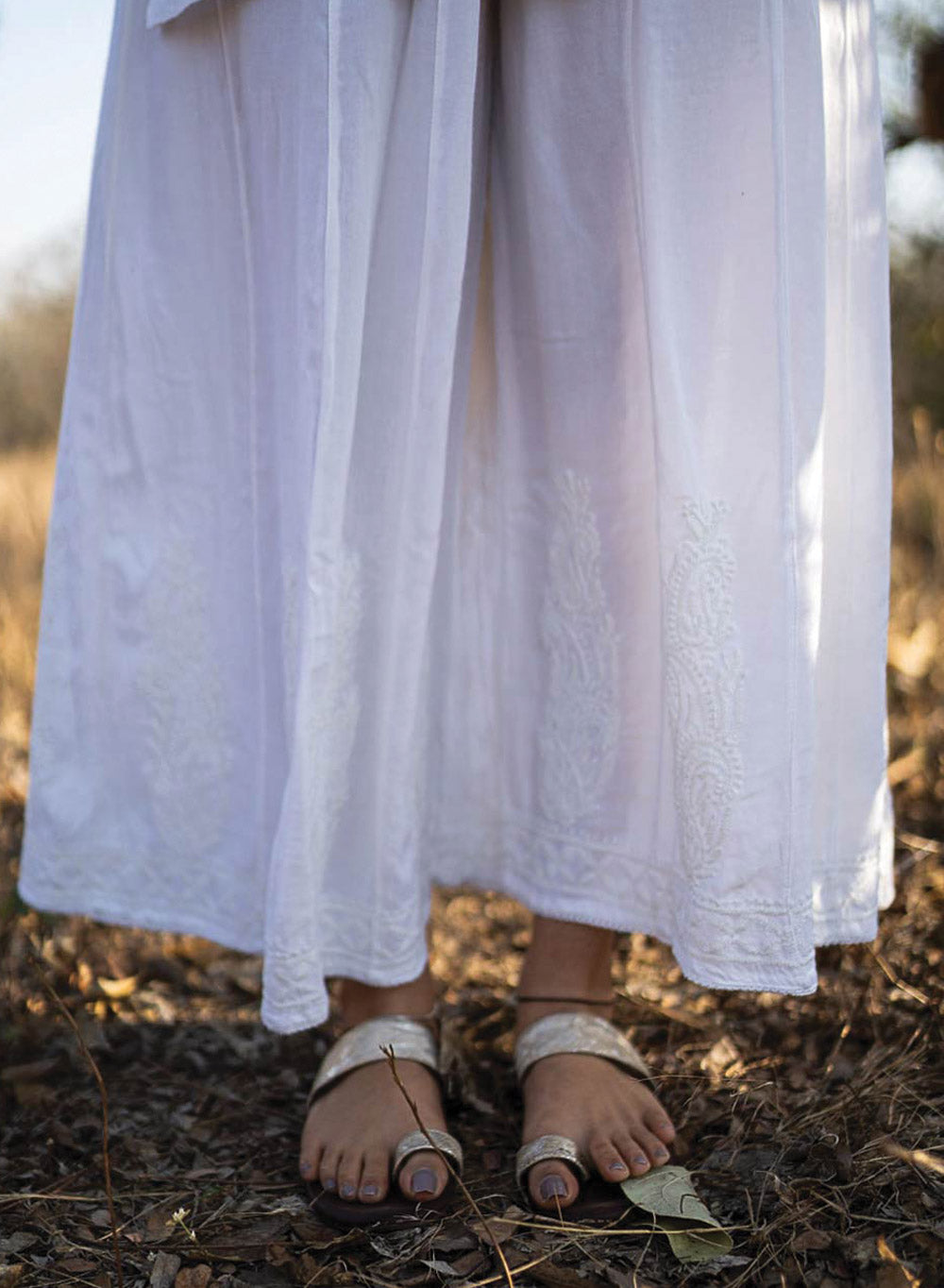 Our Tranquil Rayon Sharara (Plazzo), has been intricately hand embroidered with white cotton thread. With it's unique panel design and free flowing fabric, it is a perfect summer wardrobe addition.