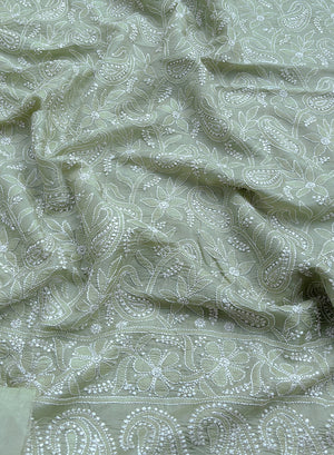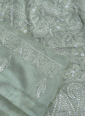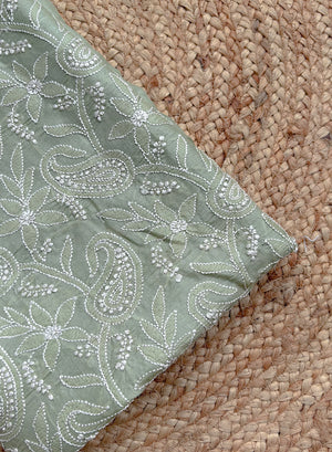 Our Light Green - Dhoop Kinaray Tussar Silk Chikankari Kurta Fabric, has hand embroidered motifs, with white twisted cotton thread.