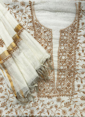Our White & Brown, mul Chanderi kurta material and dupatta set, has been hand embroidered with twisted pink cotton thread,