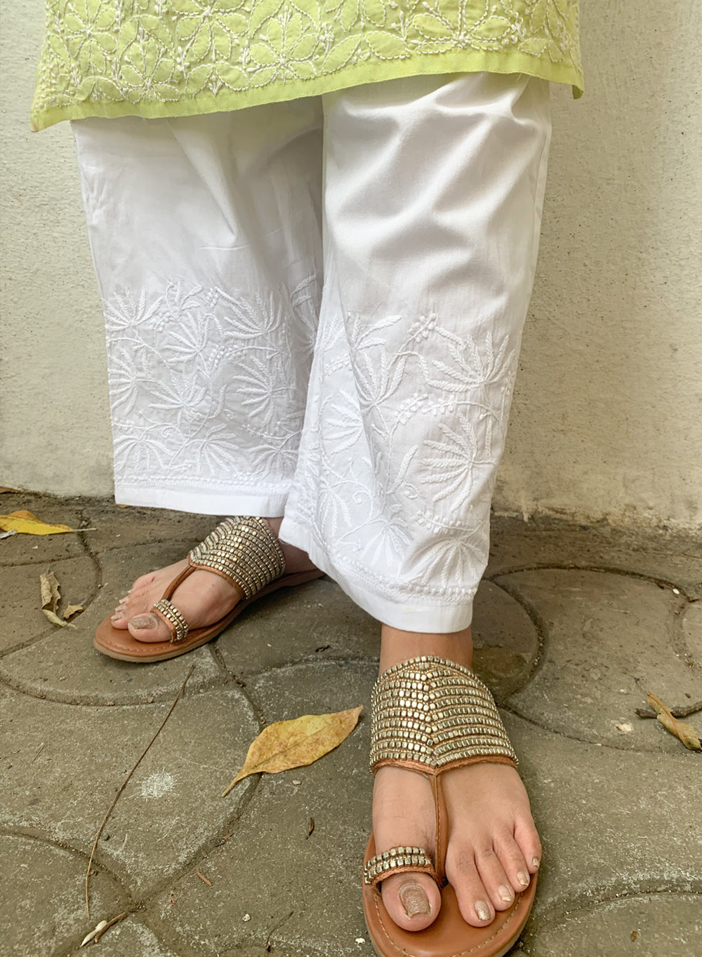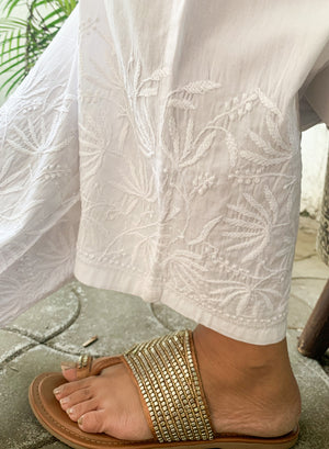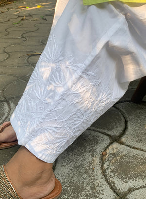 Our White Pure Cotton Palazzo, has been intricately hand embroidered with white cotton thread. With it's unique design on a soft comfortable fabric and is perfect for everyday wear.