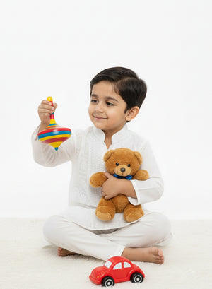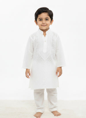Our White Front Jaal Cotton Kurta with hand embroidered chikankari in a traditional neck booti ,for Chhote Nawabs, are woven from finely milled cotton terry voile, cool and crisp against their soft skin.