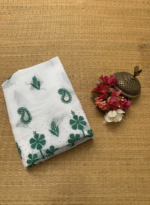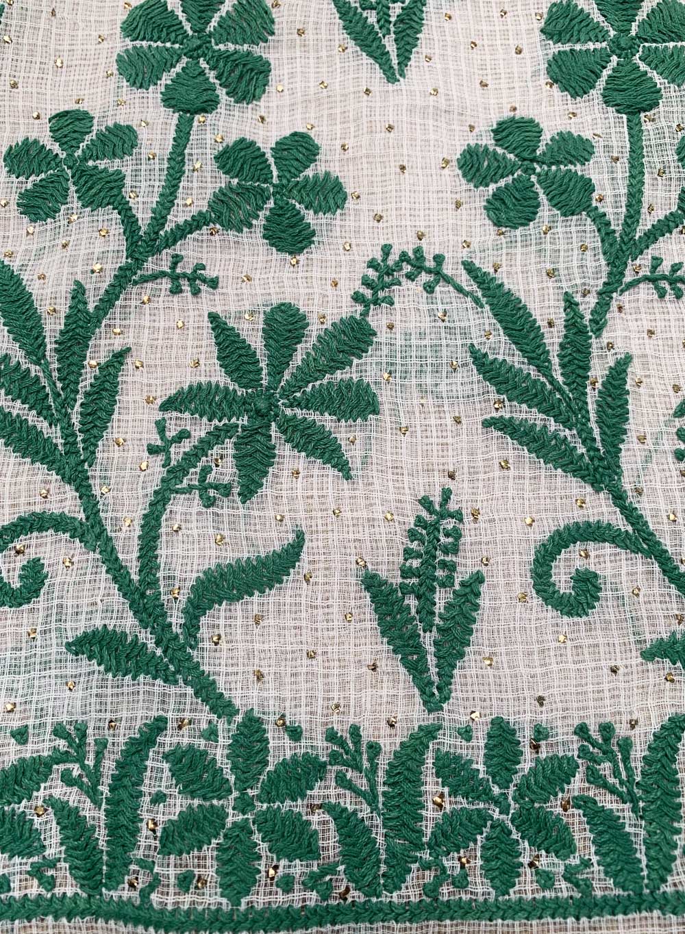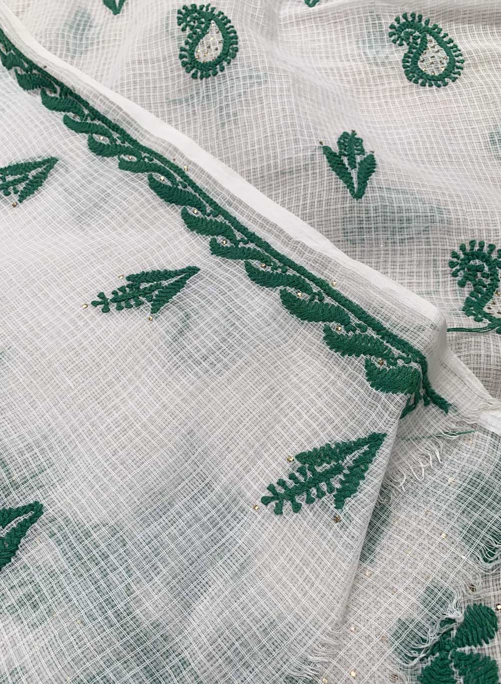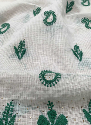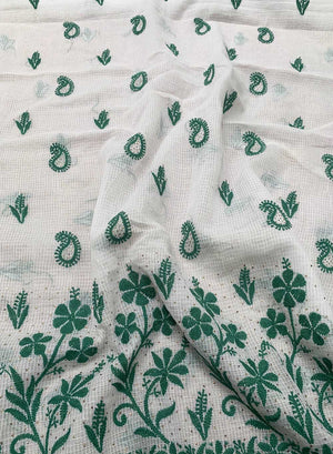 Our Green and White Kota Cotton Kurta Fabric, has hand embroidered motifs, with green twisted cotton thread.