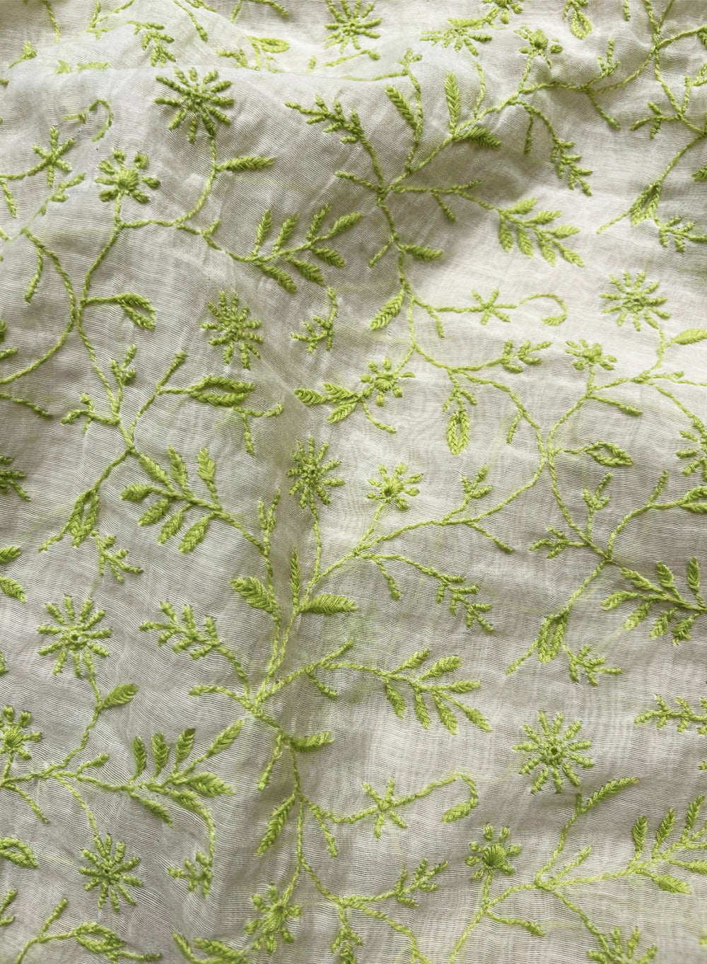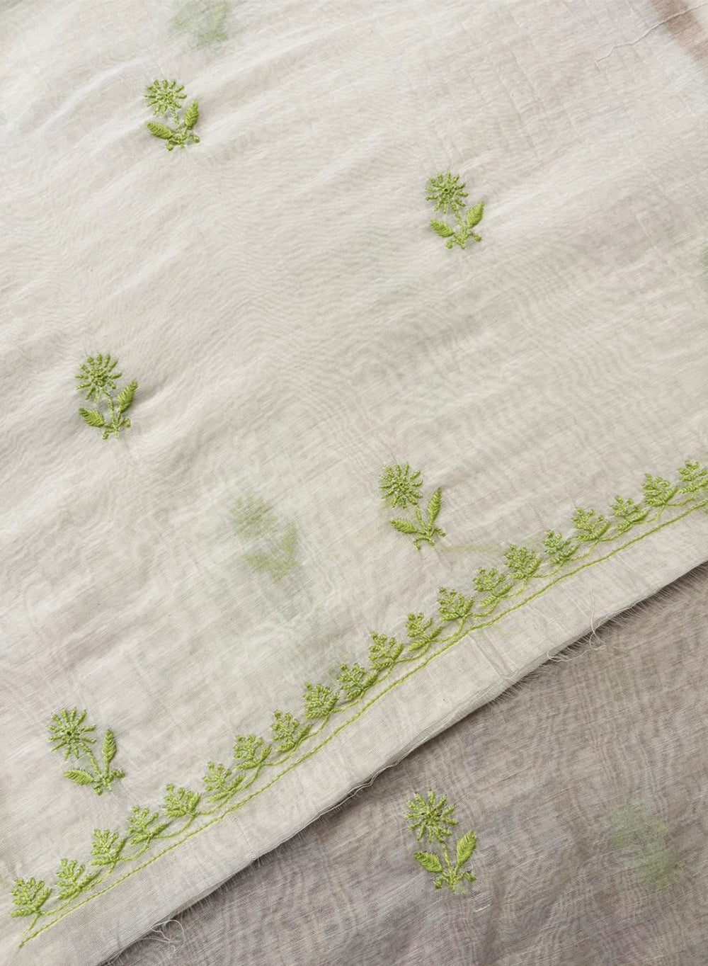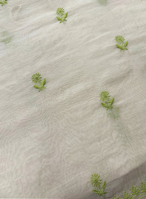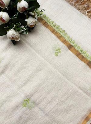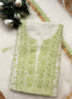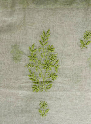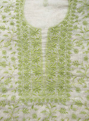 White & Green - Nayaab Mul Chanderi Chikankari Kurta Fabric