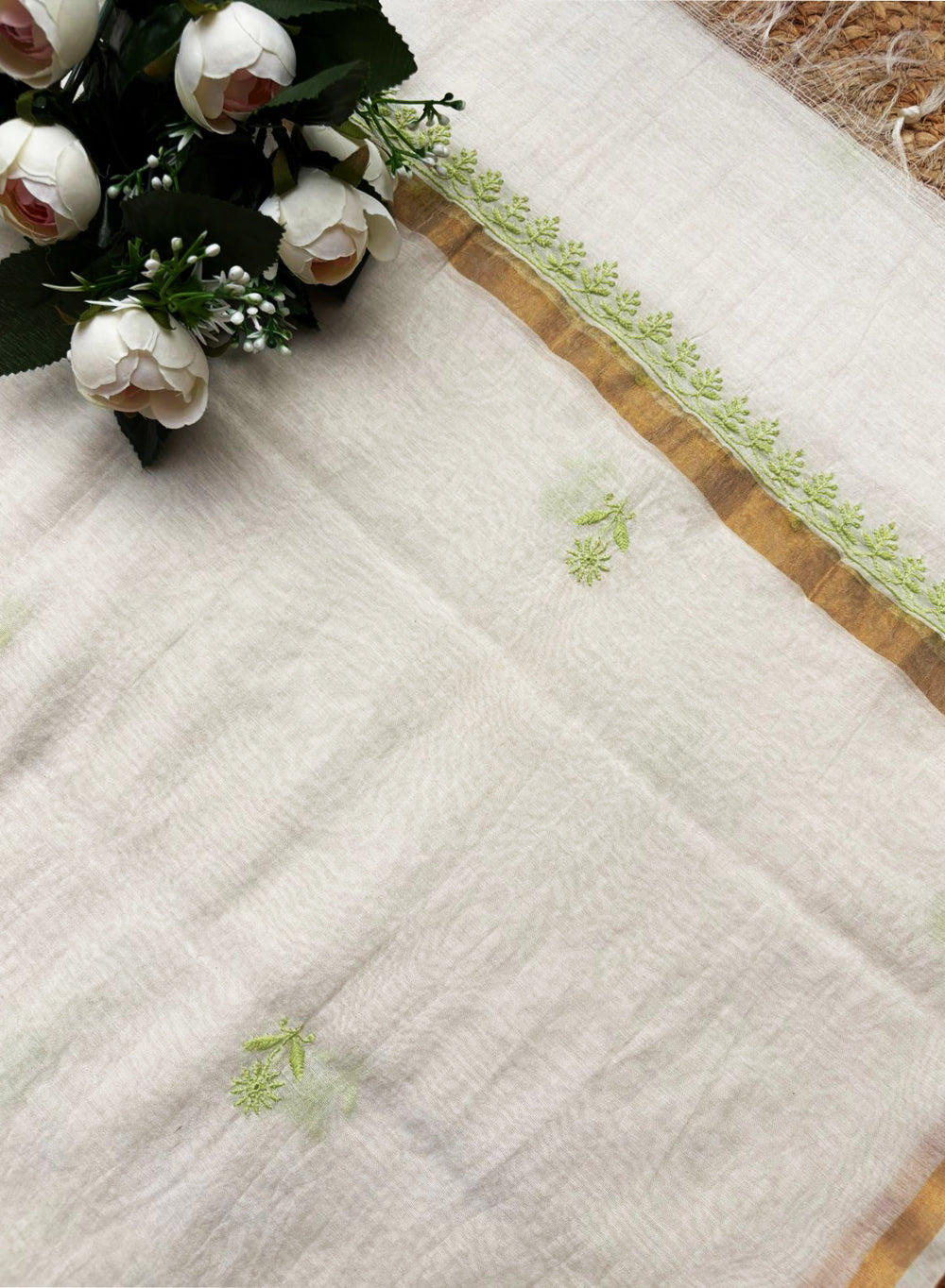Our White & Green, mul Chanderi kurta material and dupatta set, has been hand embroidered with twisted pink cotton thread,