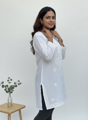 White - Gulshan Linen Cotton Double Layered Chikankari Short Top