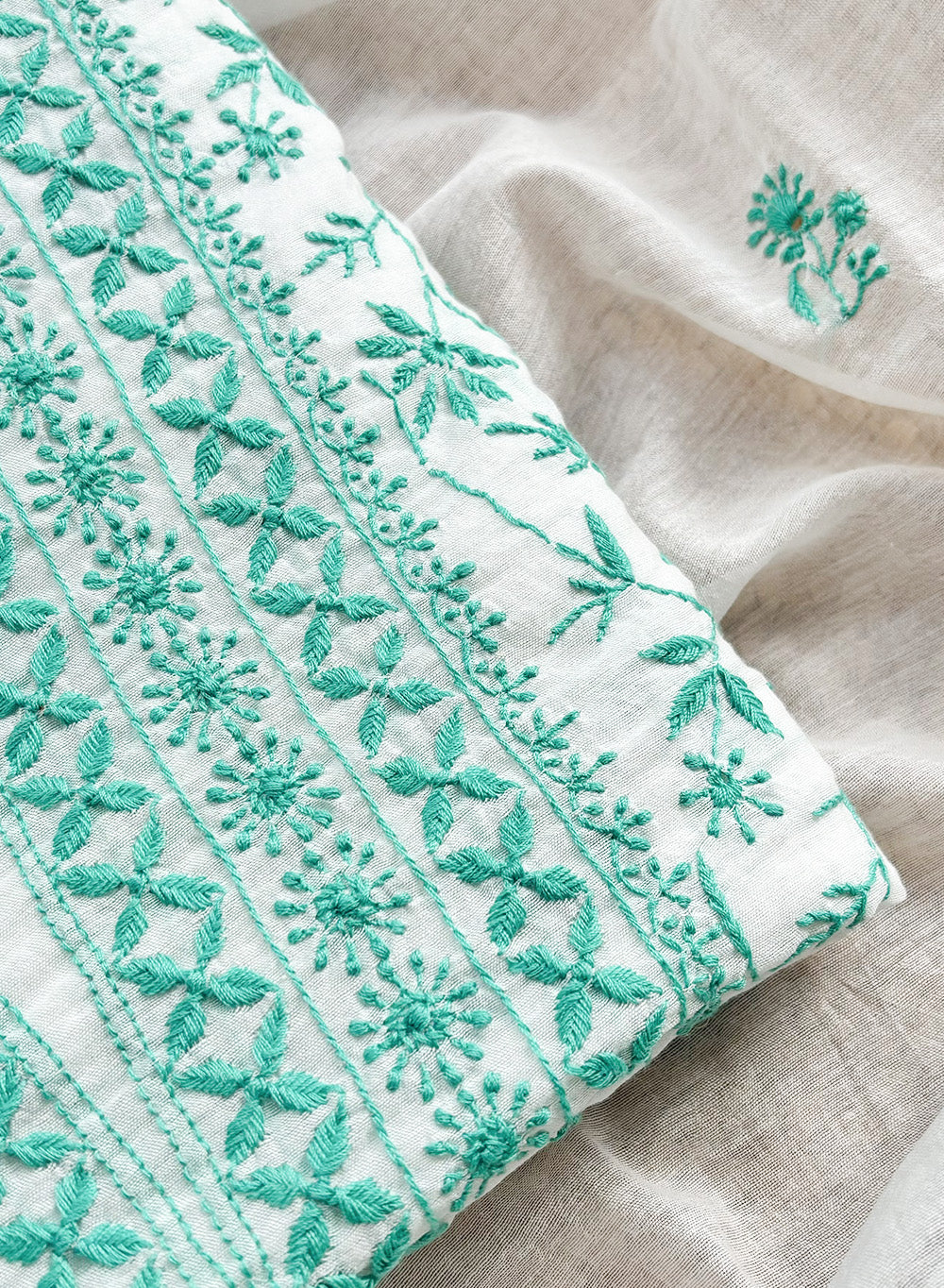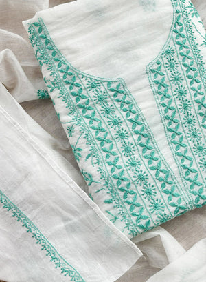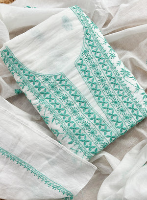 White & Turquoise - Nayaab Mul Chanderi Chikankari Kurta Fabric