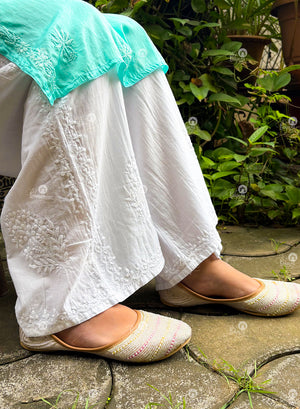 Our Chikankari Mul Cotton Side Design Wide Leg Palazzo, are crafted with mul cotton fabric, bring timeless hand embroidery to modern everyday wear, a perfect blend of tradition and ease.