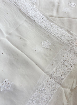 Our gorgeous hand embroidered White Viscose Chikankari Dupatta has golden mukaish embellishments. It's perfect for all festive wear.