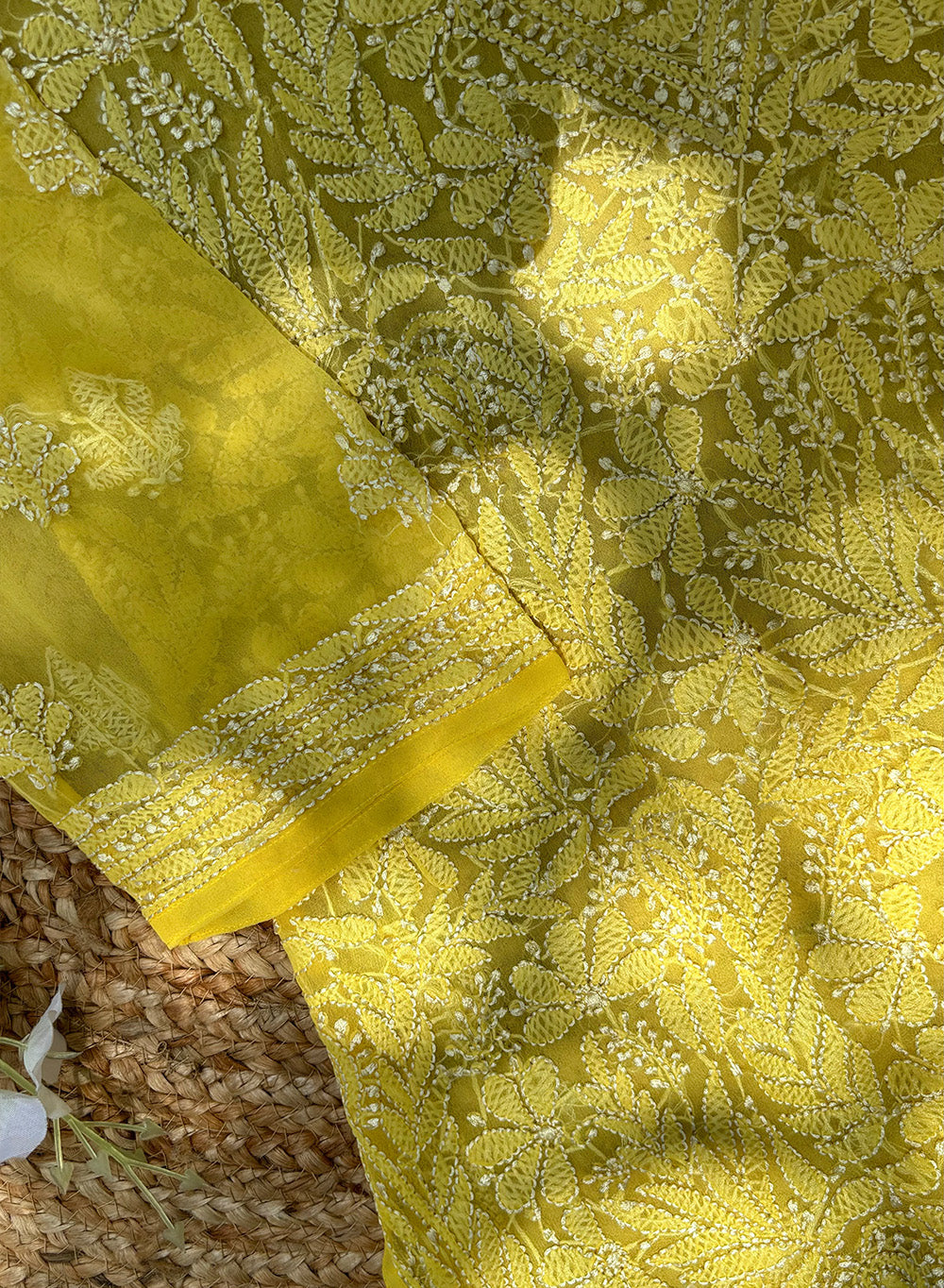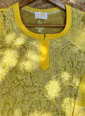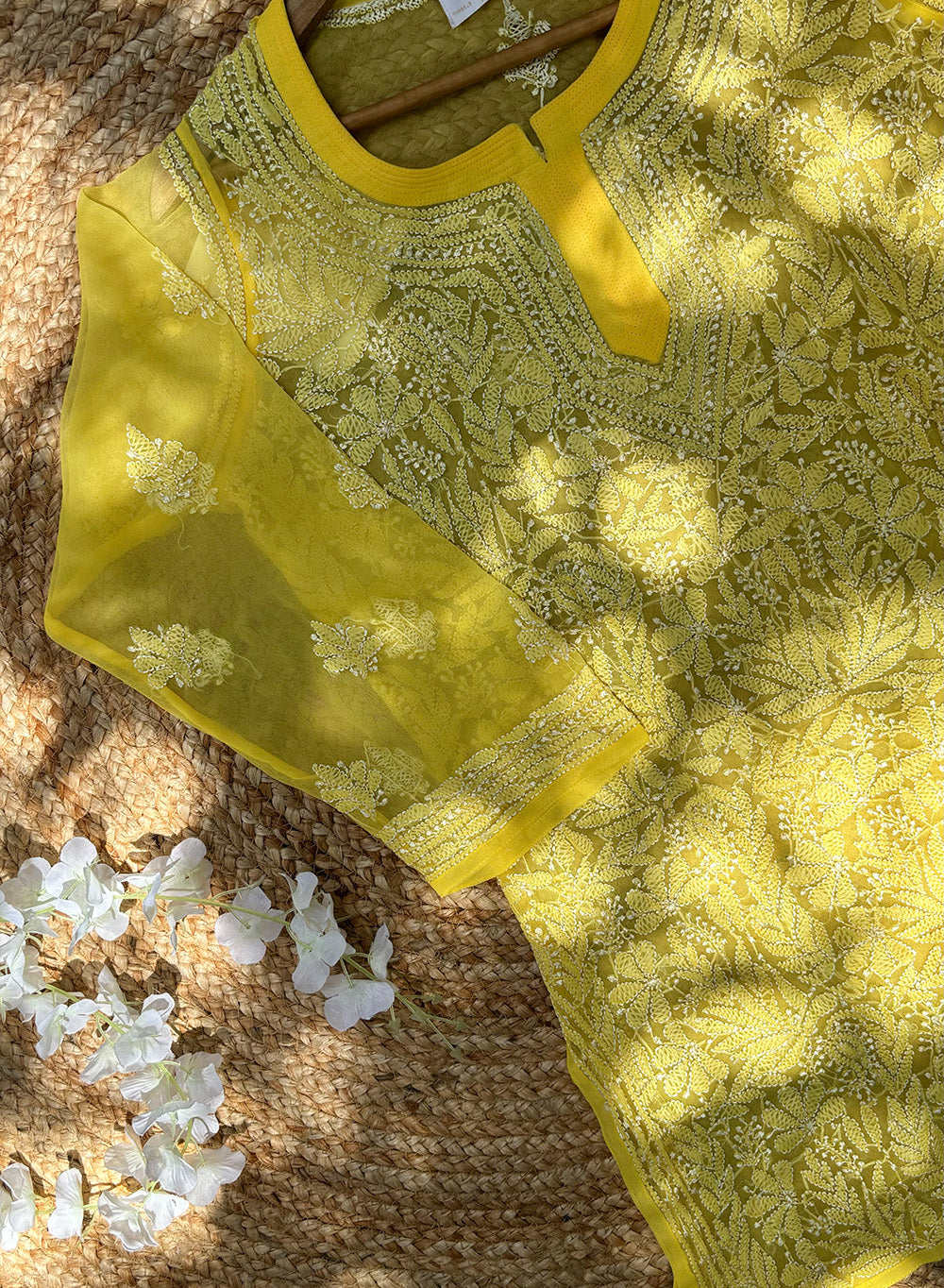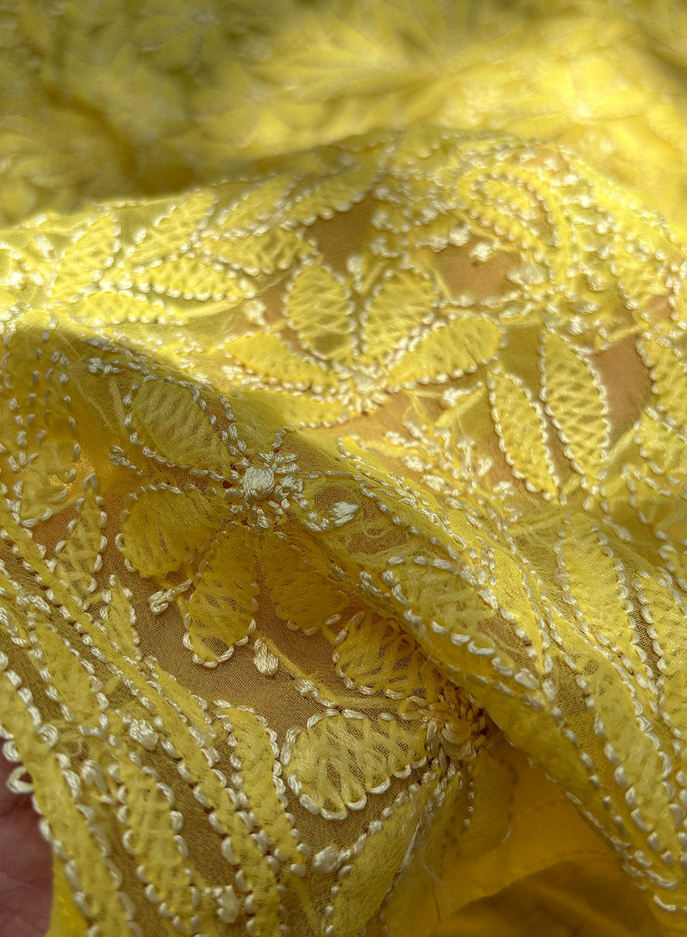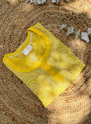 Our Gulzar Faux Georgette Chikankari Short Tops are hand embroidered, with beautiful chikankari motifs of bakhiya, phanda and murri work.