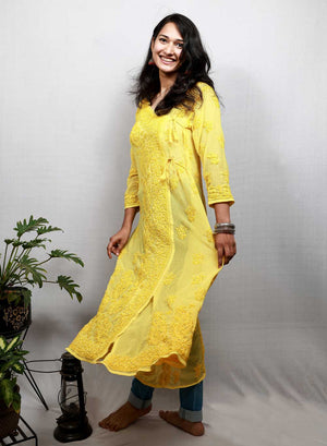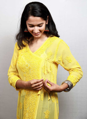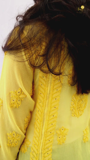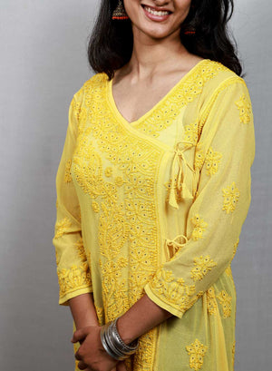 Yellow Mukaish - Anjuman Georgette Chikankari Angarakha