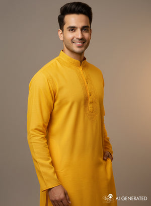 Presenting our exquisite Mango Kurta from the prestigious Nawab collection, a true masterpiece of craftsmanship. Each piece is meticulously hand-embroidered with the finest cotton thread, embodying the grace and elegance of timeless tradition.