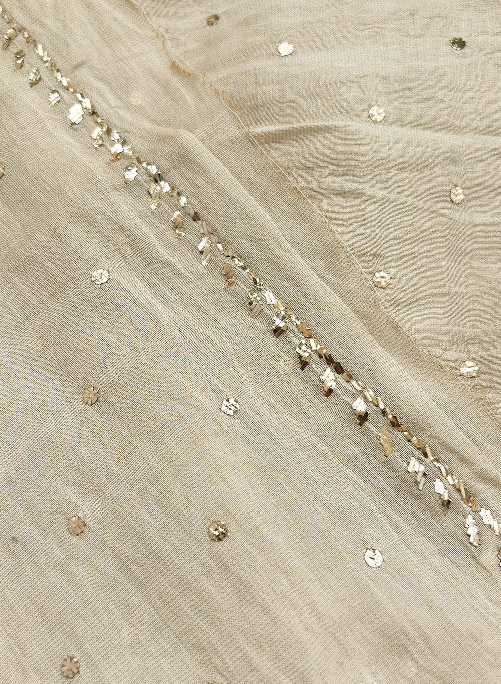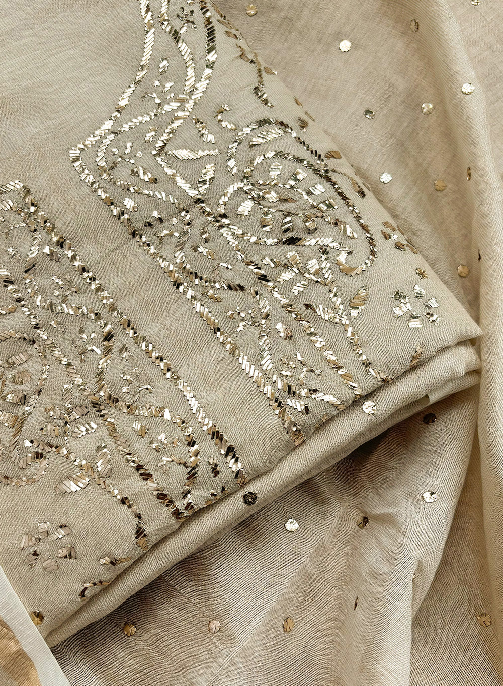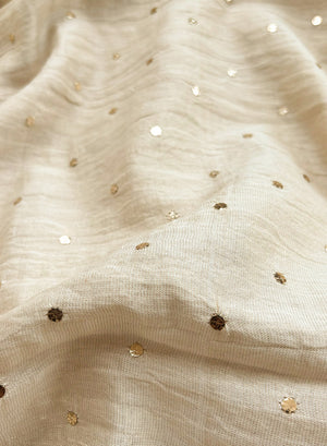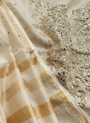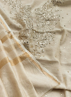 It has been painstakingly hand embellished by our karigars and is a perfect example of heritage embroidery. This fabric comes with a beautiful tissue chanderi beige and golden dupatta, that has been embellished with tikka mukaish.