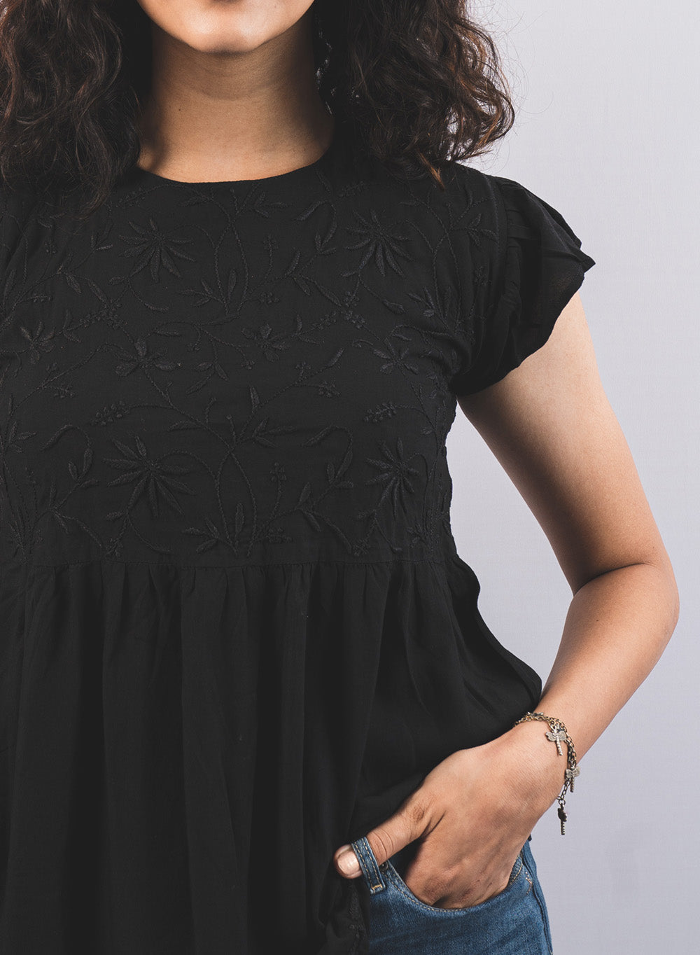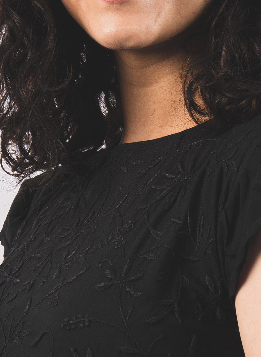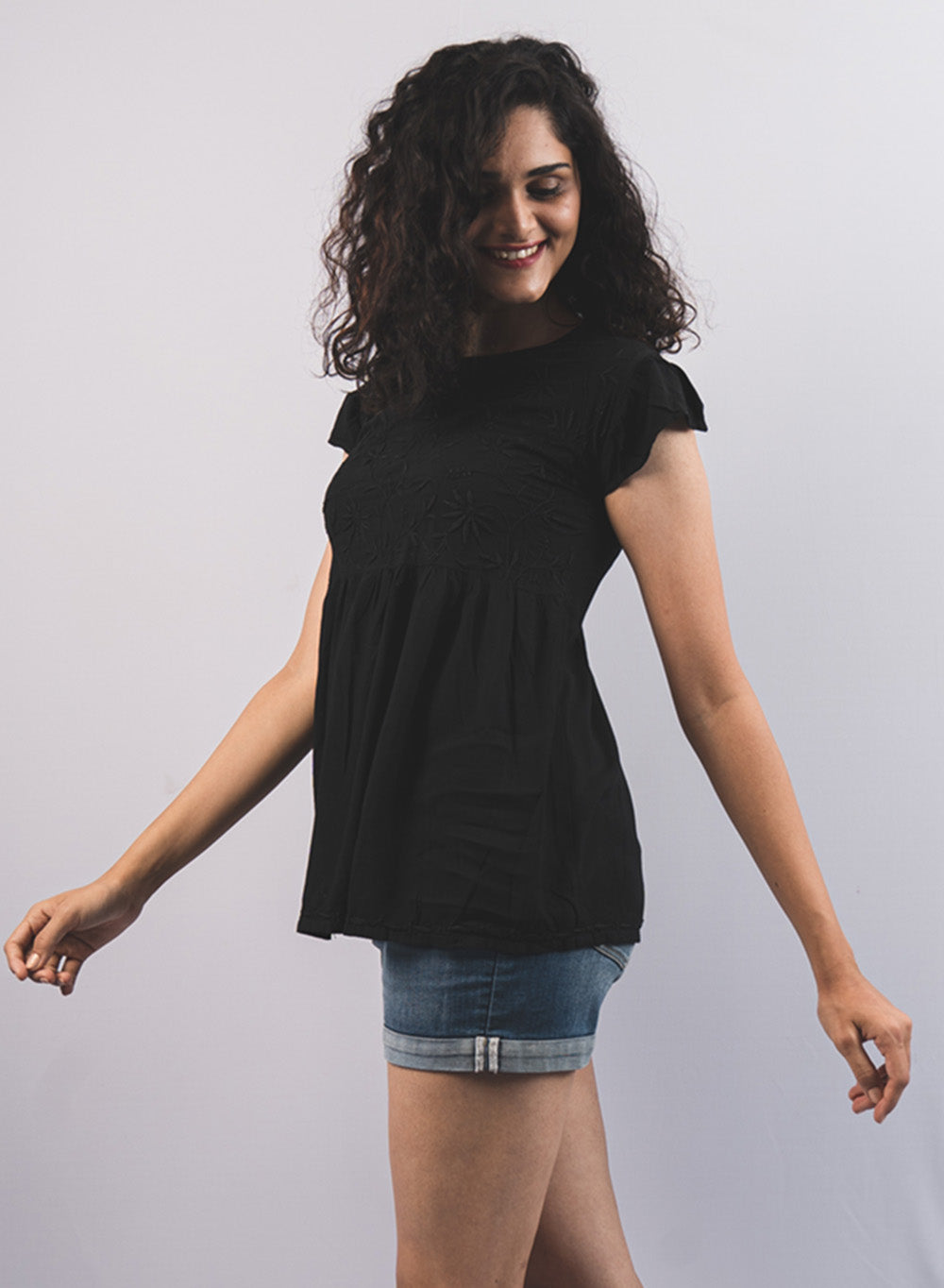 Zia means light. The soft light pastel hues of our Zia Modal Chikankari Short Tops are adorned with a beautiful floral, cotton self thread Chikankari hand embroidery.